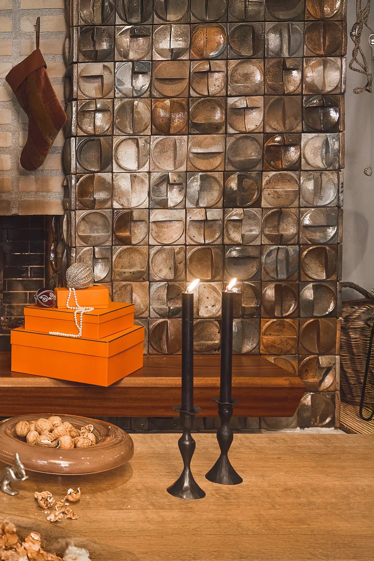 Candelabro rústico de metal negro con superficie martillada y formas suaves y orgánicas. Ideal para velas cónicas y combina fácilmente con otros candelabros.