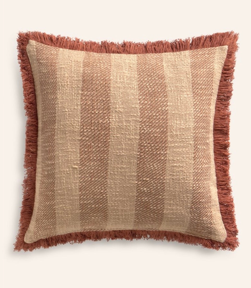 Funda de cojín rectangular de algodón con flecos en tonos tierra. Diseño con rayas tejidas. Frontal idéntico al trasero. Cierre con cremallera oculta en inferior. Cada cojín puede presentar ligeras variaciones de color debido al proceso de teñido y a la visualización en pantalla.