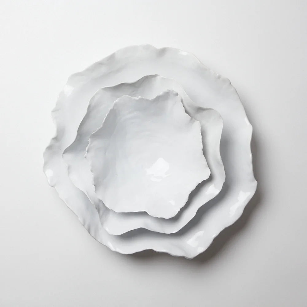 Estos platos son únicos y están hechos a mano, con una apariencia rústica pero a la vez elegante; algunos piensan que se asemejan a una hermosa concha de ostra. Ponerlos en la mesa crea una decoración diferente e imaginativa. Sirva una deliciosa ensalada, pasta o sopa y seguro que recibirá comentarios sobre estos exquisitos platos.