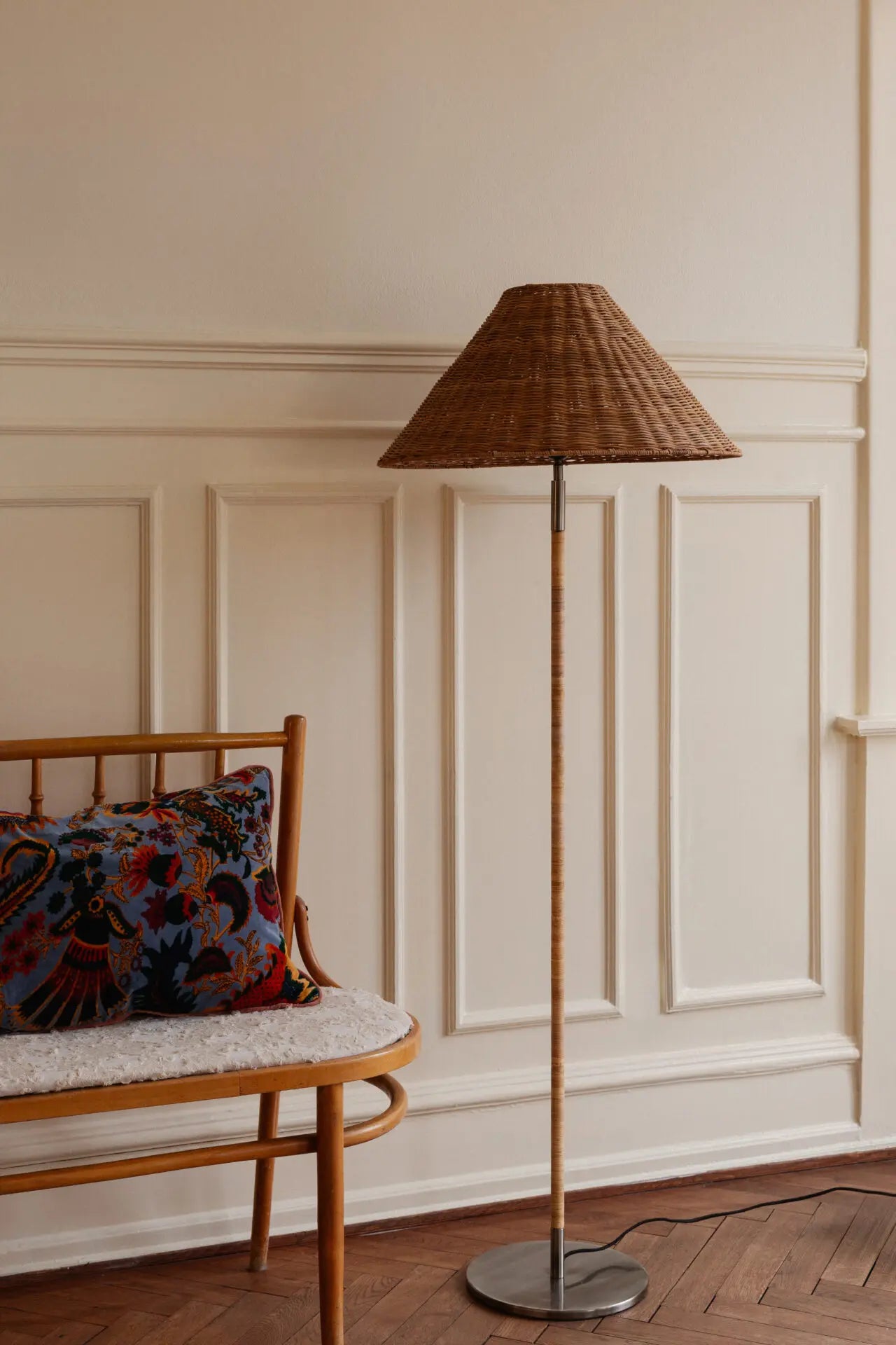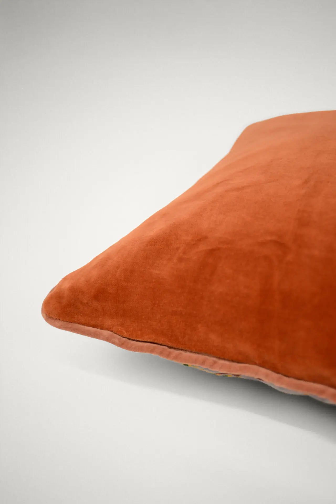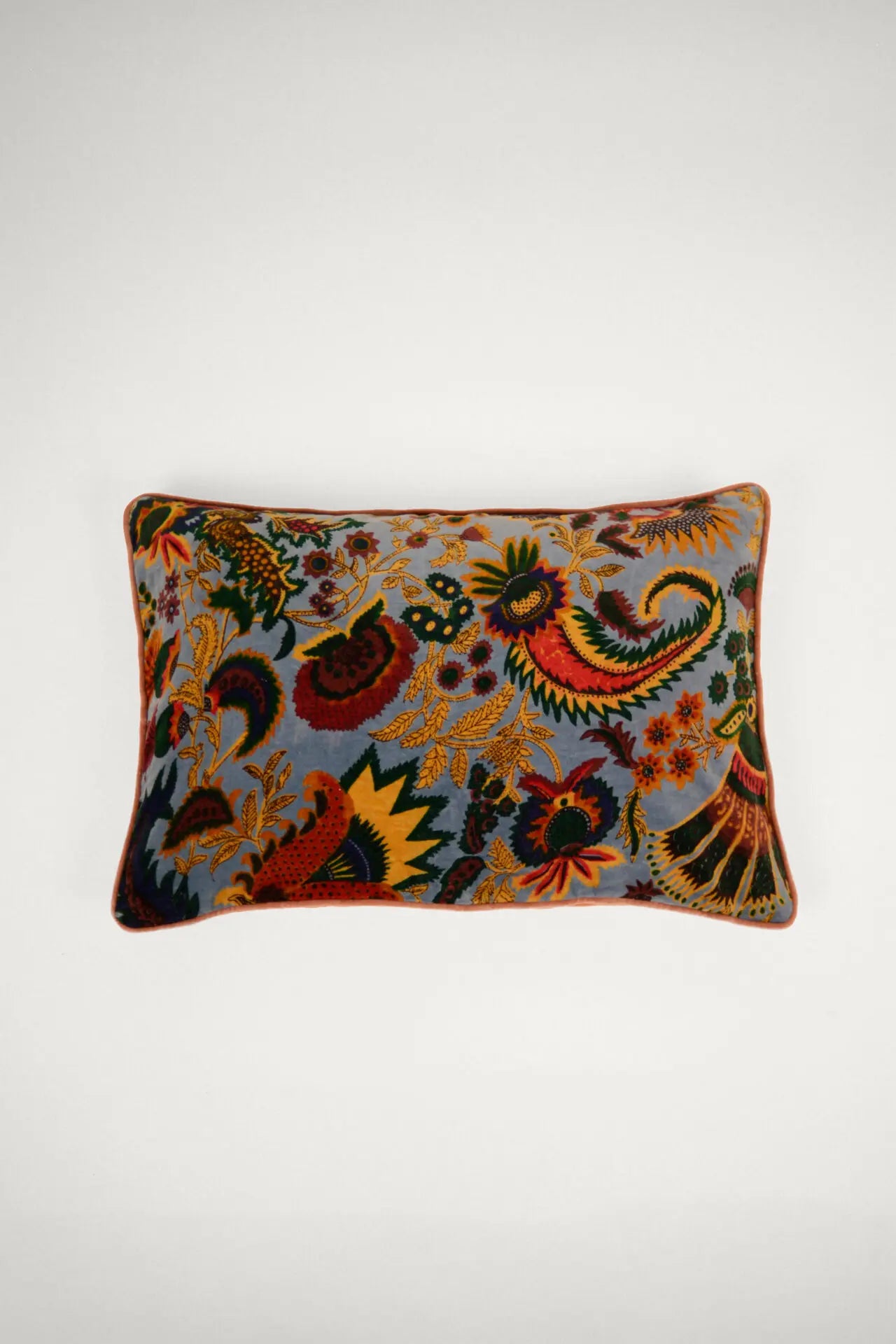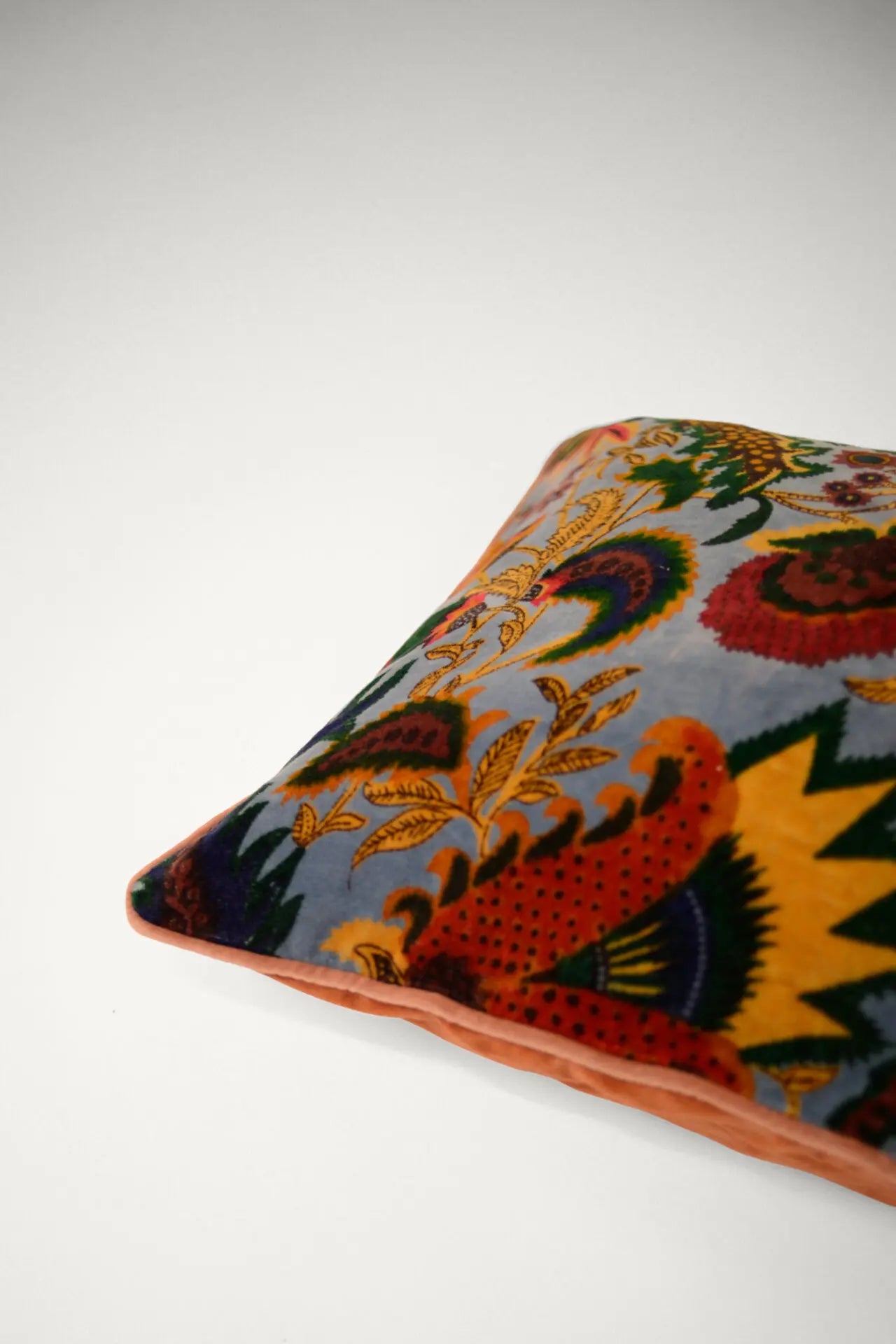 Funda de cojín de terciopelo de algodón suave con un patrón floral inspirado en el paisley en la parte delantera y una espalda de color sólido.
